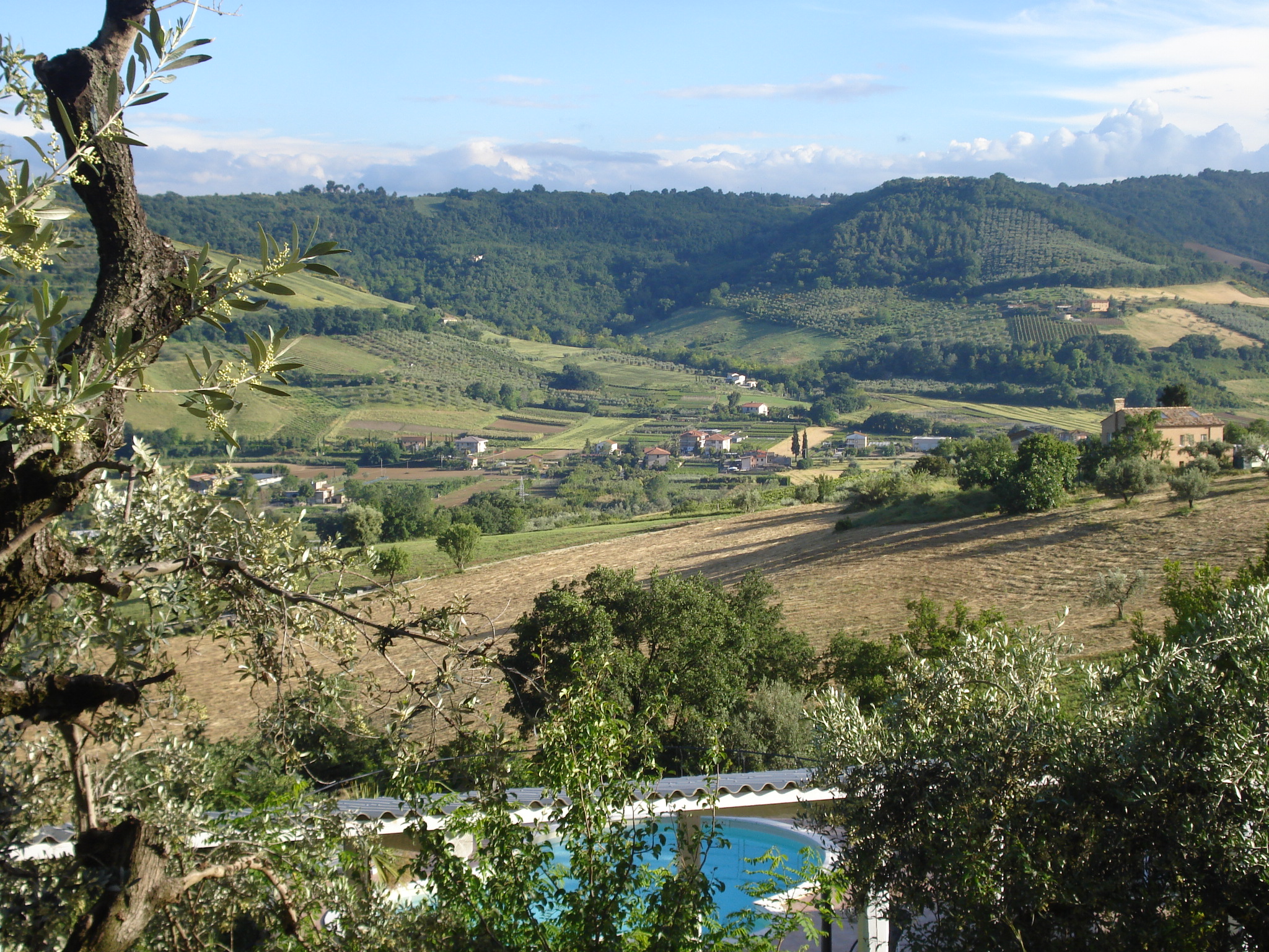 Blick von unserem Olivenhang über den Pool in die Olivenhänge unserer Nachbarn.